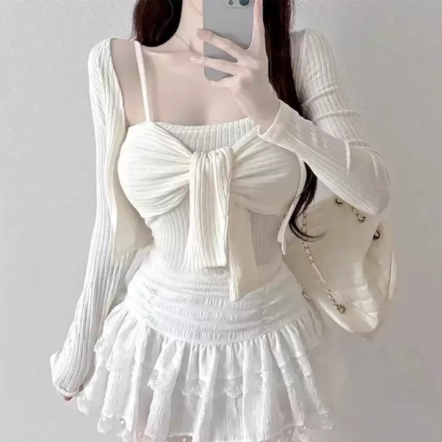 【カラー】 ホワイト / ブラック 【素材】 アクリル60% / ポリエステル40% 【サイズ】 フリーサイズ キャミソール:着丈30cm / 身幅32cm カーディガン:着丈36cm / 肩幅36cm / 身幅36cm / 袖丈60cm ※測り方によって、1~3cm程の誤差が生じる可能性がございます。 ※モニターの環境によって実物と色が違って見える場合がございます。 (KT 1472)