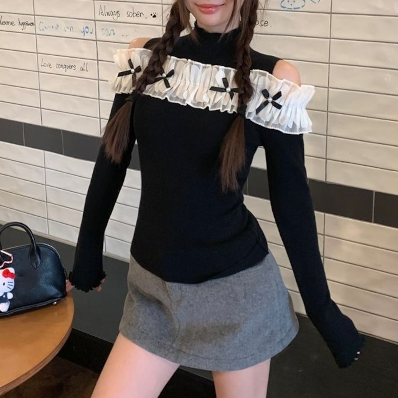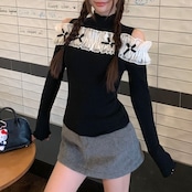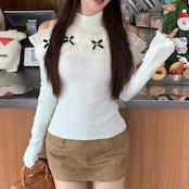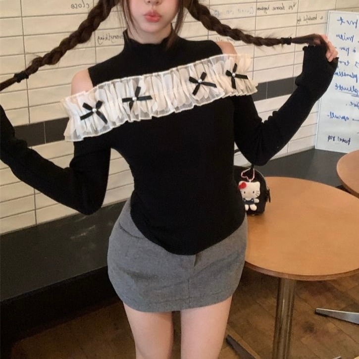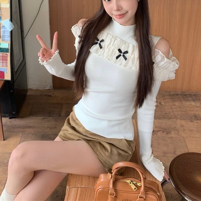 オープンショルダーフリルリボントップス